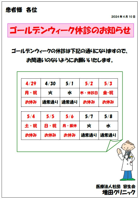 増田クリニック/ようせいクリニック ゴールデンウィーク休業のお知らせ